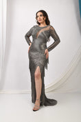 Vestido dorado/nude/silver con pedreria en estilo corazon alrededor del cuello, con flecos de piedras en forma de cascada hasta abajo, manga largas y abertura de un lado