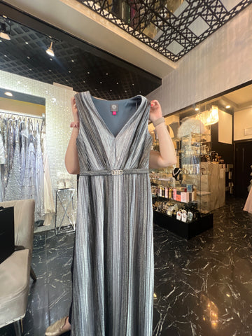 Descubra la elegancia lujosa de Silver Mist con este vestido de encaje de cuello V de color gris y plateado. Detalles sutiles de encaje contrastantes crean un look fino pero sencillo que ofrece incomparable estilo...