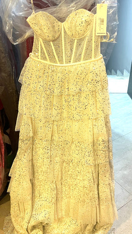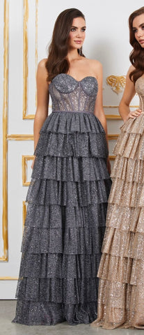 Define tu estilo con nuestro lujoso vestido estilo princesa de color gris claro y plateado, con un cuello V de mangas largas y adornado con plumas en los hombros. El pecho y la falda destacan...