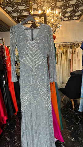 Vestido dorado/nude/silver con pedreria en estilo corazon alrededor del cuello, con flecos de piedras en forma de cascada hasta abajo, manga largas y abertura de un lado