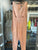 Un lujoso salto de cama rosado claro con detalle de flores bañadas en piedras preciosas y flecos en los hombros, para un look fino y sencillo.