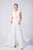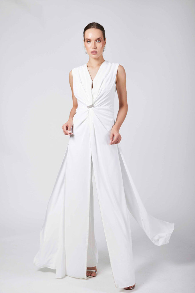 Jumpsuit blanco con telas cayendo en cuatro partes. De cuello V con drapeado en el top y brillo sutil a lo largo de la tela.
