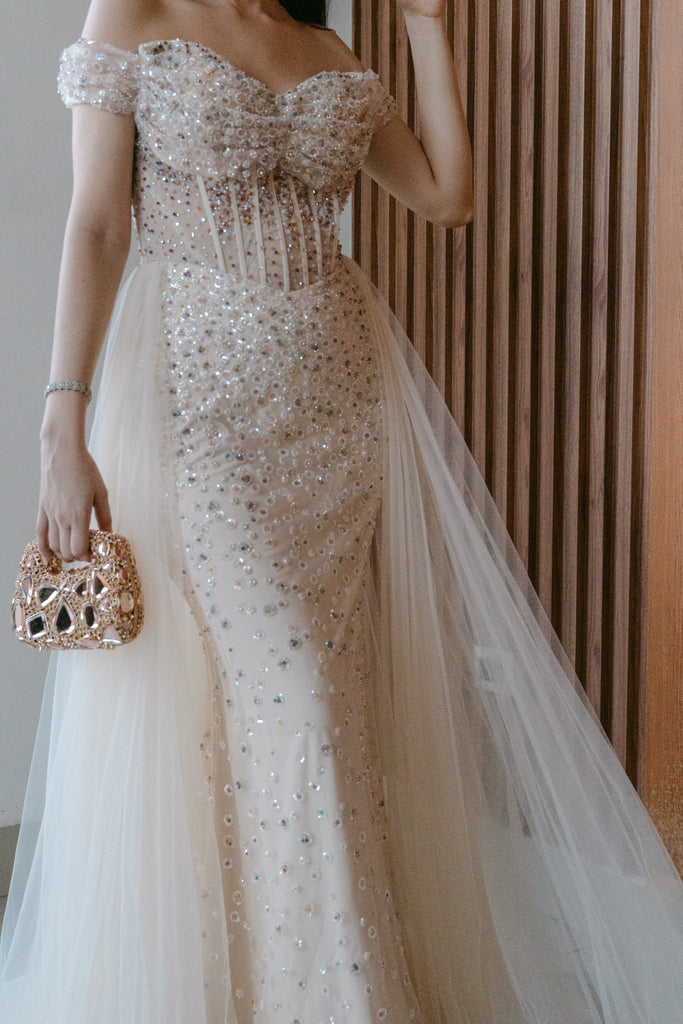 Diseño perlado con corte sirena, hombros caídos y corset trabajado a mano. La sobrefalda de tul crea un look doble: elegante y totalmente fotografiable.