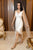 Vestido blanco de tirantes con piedras plateadas, cuello V y corte midi diagonal con plumas en los bordes.