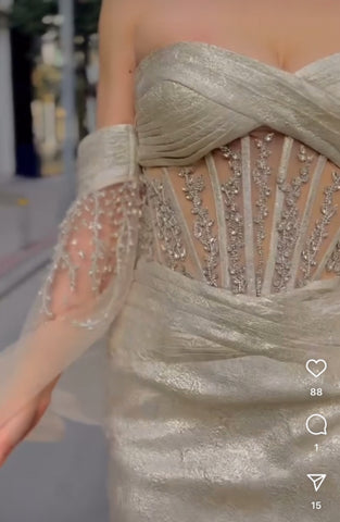 Champagne Dream: A Regal Beige Dress with Gold Stones