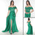 Vestido largo verde esmeralda con tirantes gruesos, corse con piedras y encaje, con abertura y extension de cola al lado.