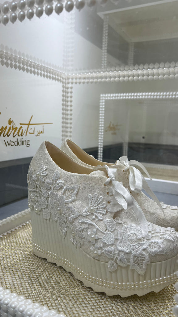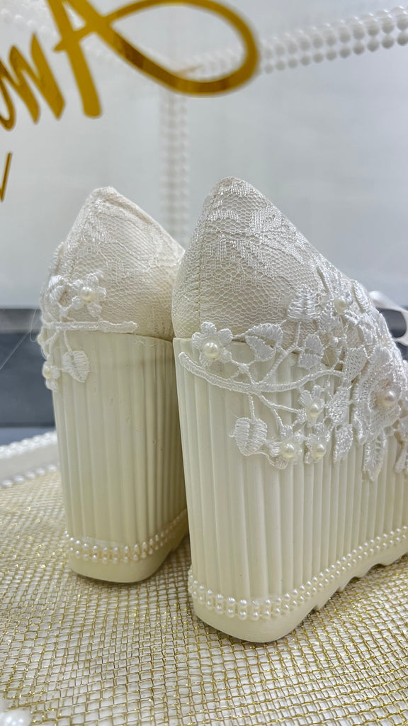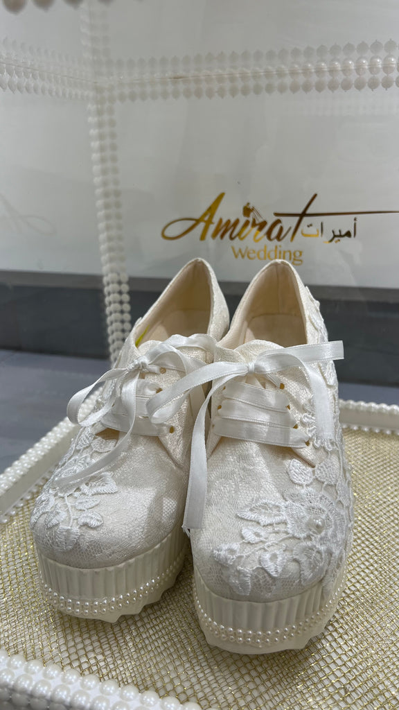 Tennis estilo tacon con encaje, flores de diferentes estilos y perlas en el borde posterior (blanco)