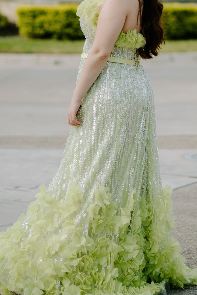 Vestido verde lima estilo A strapless, con cinturon y flores 3D, de tela con perlas y beads