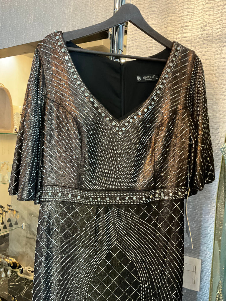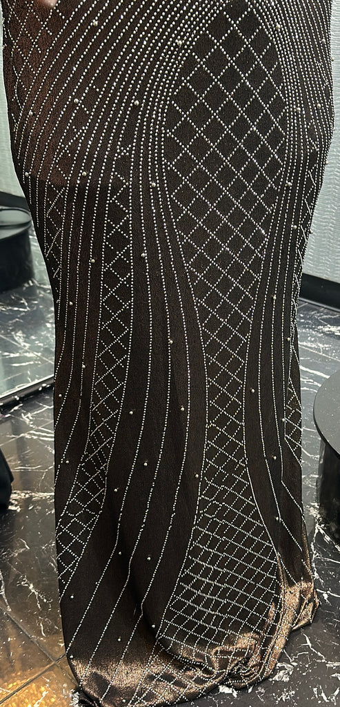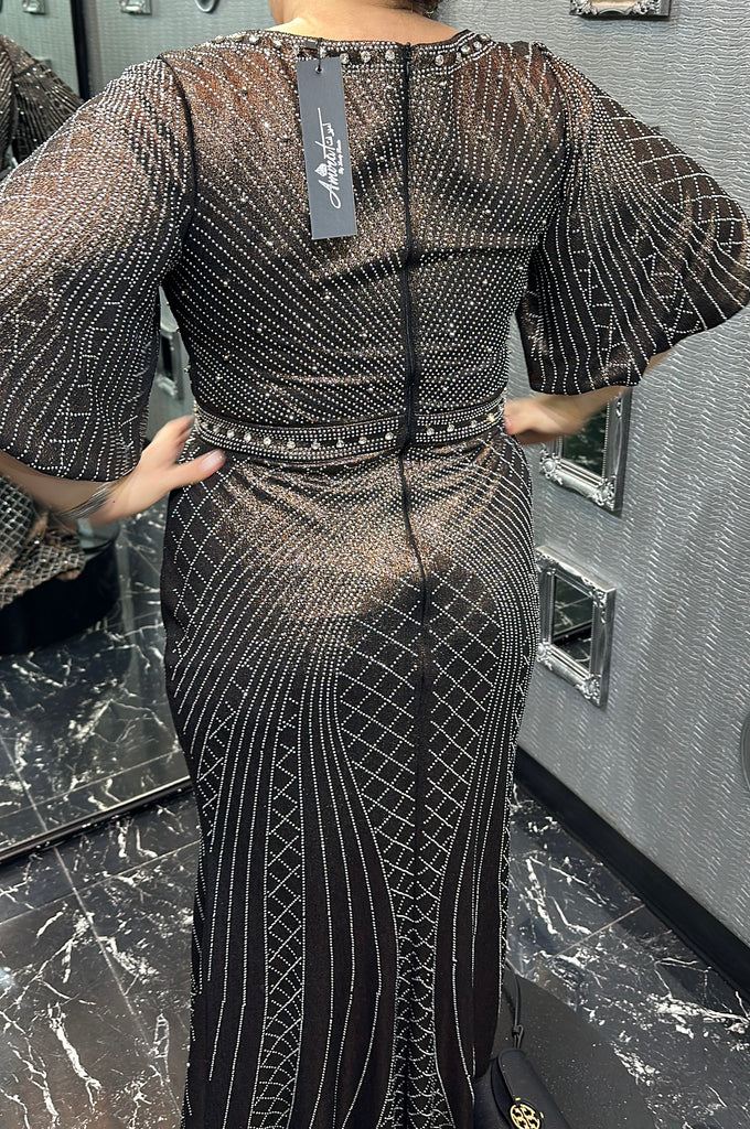 Vestido largo cafe metalico, cuello V con brillos plateados y cristales, con mangas 3/4