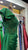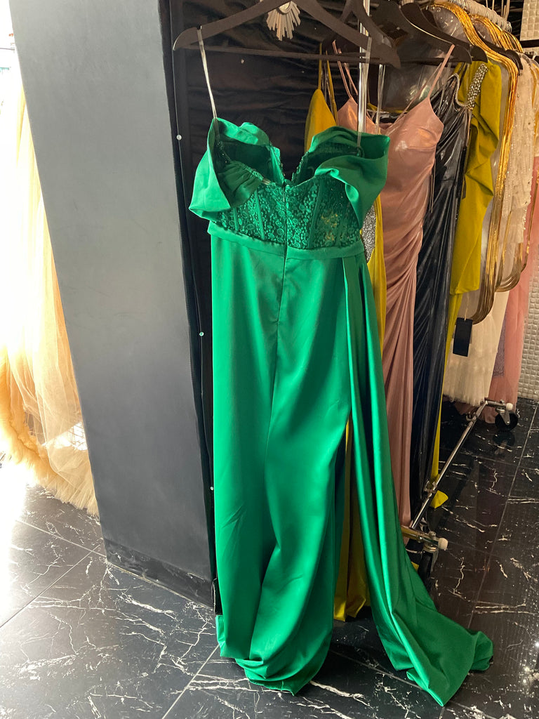 Vestido largo verde esmeralda con tirantes gruesos, corse con piedras y encaje, con abertura y extension de cola al lado.