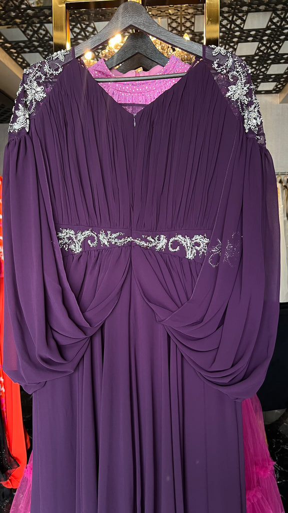 Vestido de noche morado uva con capa y detalles de drapeado y cristales plateados en hombros y cintura.