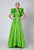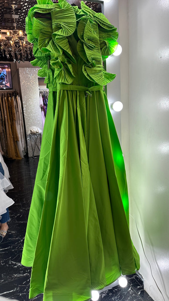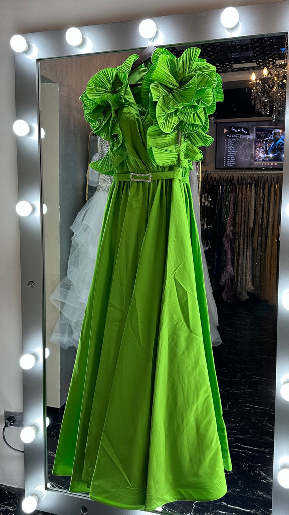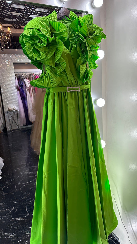 Vestido largo verde manzana con ruffles estilo petalos en los hombros y con cinturon con cristales desmontable.
