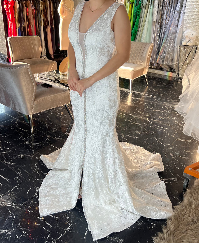 El vestido nupcial Mariam es una elegante combinación de blanco y plata que se adorna con un hermoso cinturón de cristal y un coletero desmontable. Deslumbrante y sofisticado, brilla para ser el vestido justo para una novia radiante.