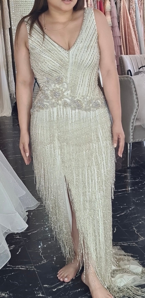 Un vestido imponente. El Sparkling Ivory de Silver Crystal Embellished Floor-Length Dress fusiona lujo y sencillez. El tejido blanco lleva una exquisita corona de cristales plateados adornando el vestido, mientras cristales adicionales cuelgan majestuosamente de la cintura para abajo.